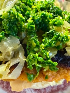 Method: Add the roasted sweet potatoes, roasted bell peppers, and garlic to a food processor and process until broken down. Add everything else except the oats and flour and process until smooth, stopping to scrape down the bowl a few times. Add the oats and flour and pulse through. Chill for 30 minutes. Shape into 8 large burgers. Pan-fry in a hot skillet until hot through and golden brown on both sides. Alternatively, you could bake them, but I haven't tried that. I would put the burgers on parchment paper. Heat oven to 400 degrees and bake for 20-25 minutes, flipping halfway through.Serve with your choice of toppings. I used vegan mayo, mustard, ketchup, raw kraut, and homemade Italian Gremolata.I froze the extras.